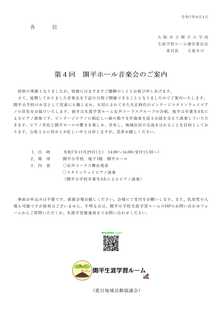 延期しておりました開平ホール音楽会を11月29日(土)に実施することの決まりました!お楽しみに♪